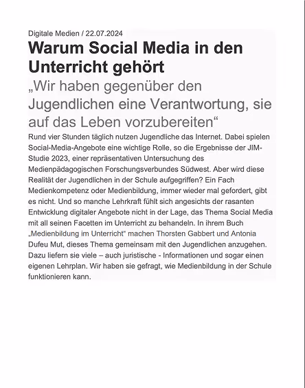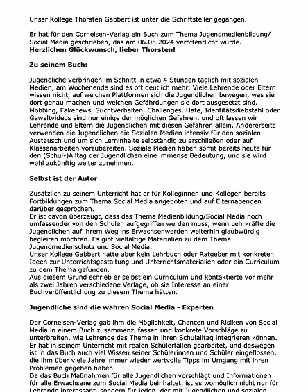 Mein Name ist Thorsten Gabbert. In meinen Seminaren, Fortbildungen und Vorträgen zeige ich, wie wir Jugendliche im Umgang mit den Sozialen Medien besser begleiten, stärken und schützen. Als Berufsschullehrer unterrichte ich seit 2016 das Fach Medienbildung-Social Media als reguläres und abschlussrelevantes Unterrichtsfach. Ich habe im Unterricht viel von meinen Schülerinnen und Schülern erfahren und diese Erfahrungen in einem Buch zusammengefasst. In meinen Veranstaltungen gebe ich mein Wissen gerne weiter.